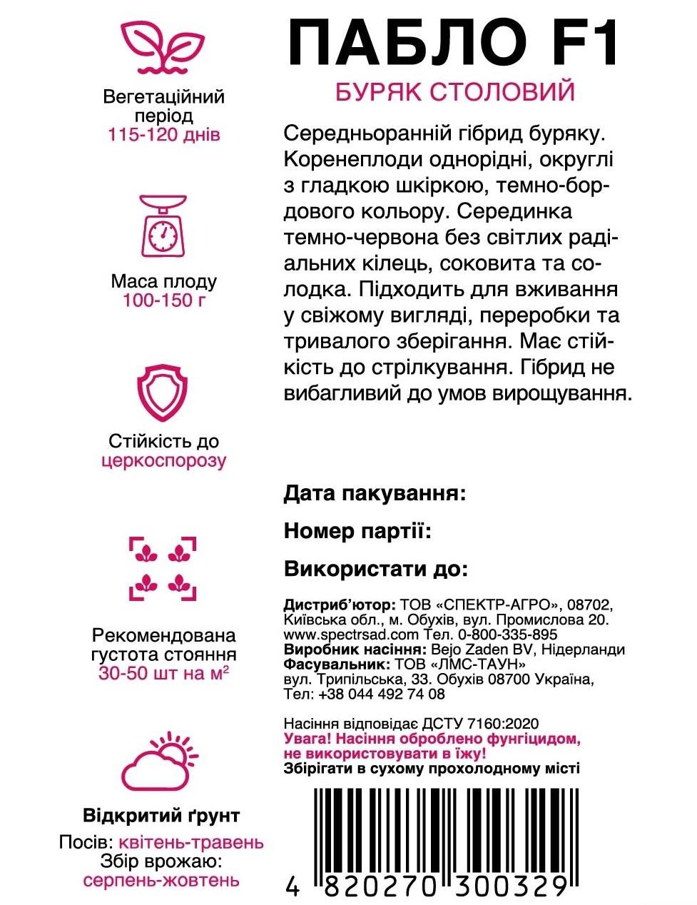Насіння буряка столового Пабло F1 — середньоранній голландський гібрид з терміном дозрівання 115–120 днів. Коренеплоди однорідні, округлі з гладкою шкіркою, темно-бордового кольору. Середина темно-червона, без світлих радіальних кілець, соковита та солодка. Маса одного плоду становить 100–150 г.