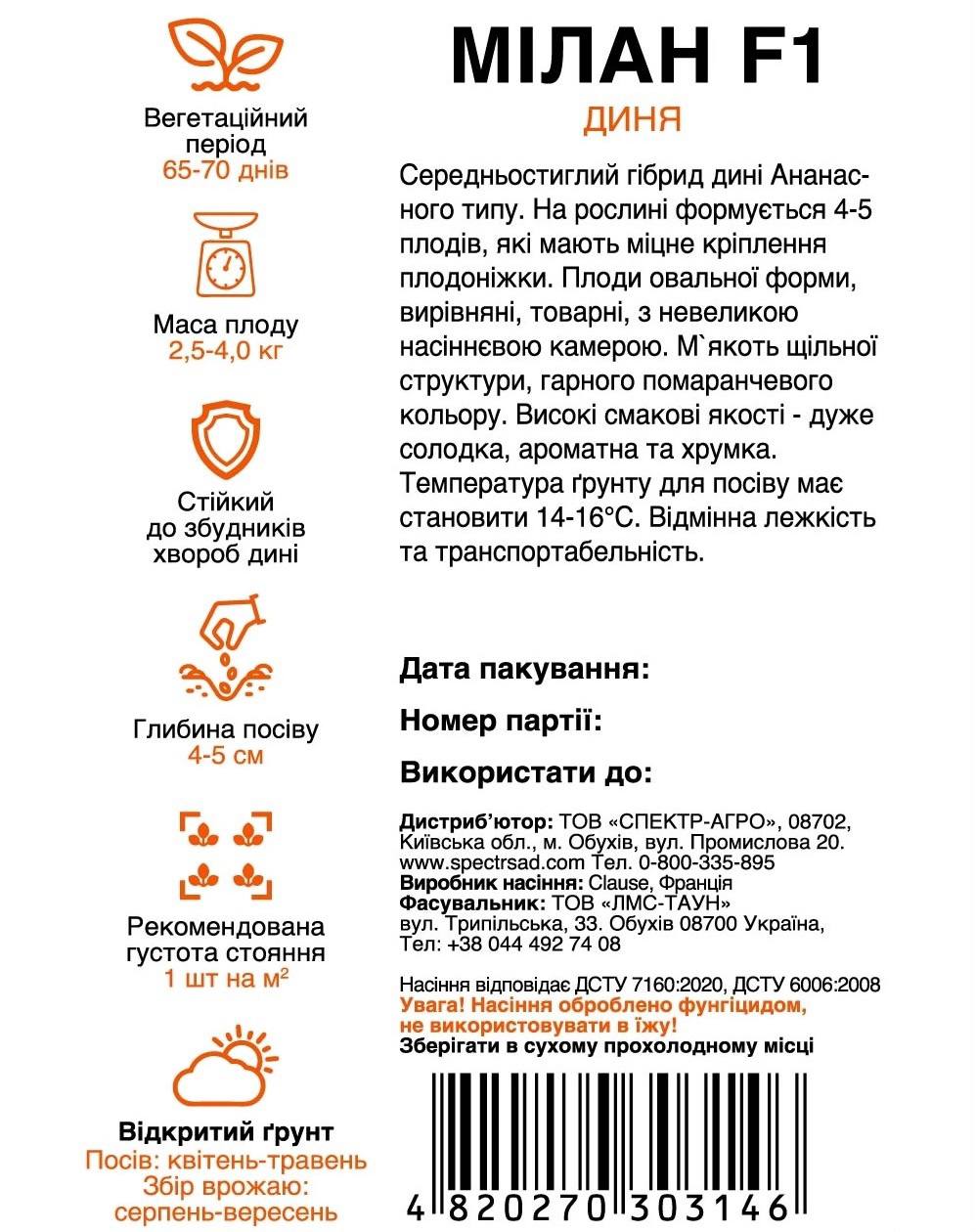 Насіння Дині Мілан F1 — середньостиглий гібрид Ананасного типу з помаранчевою м’якоттю. На рослині формується 4–5 плодів, які мають міцне кріплення плодоніжки. Плоди овальної форми, вирівняні, товарні. М’якуш щільний, з невеликою насіннєвою камерою, гарного помаранчевого кольору. Середня маса одного плоду становить 2,5–4,0 кг.