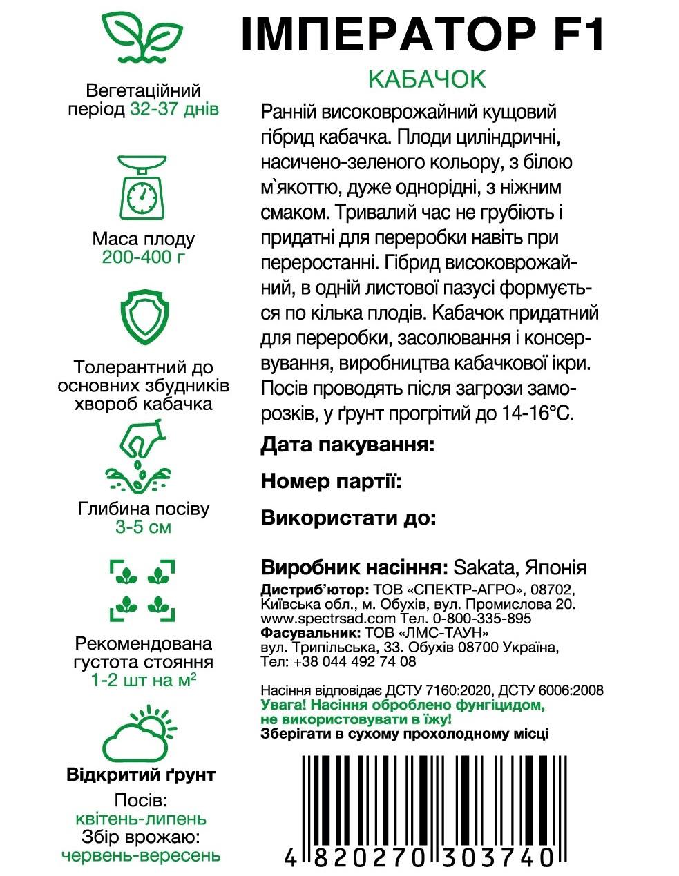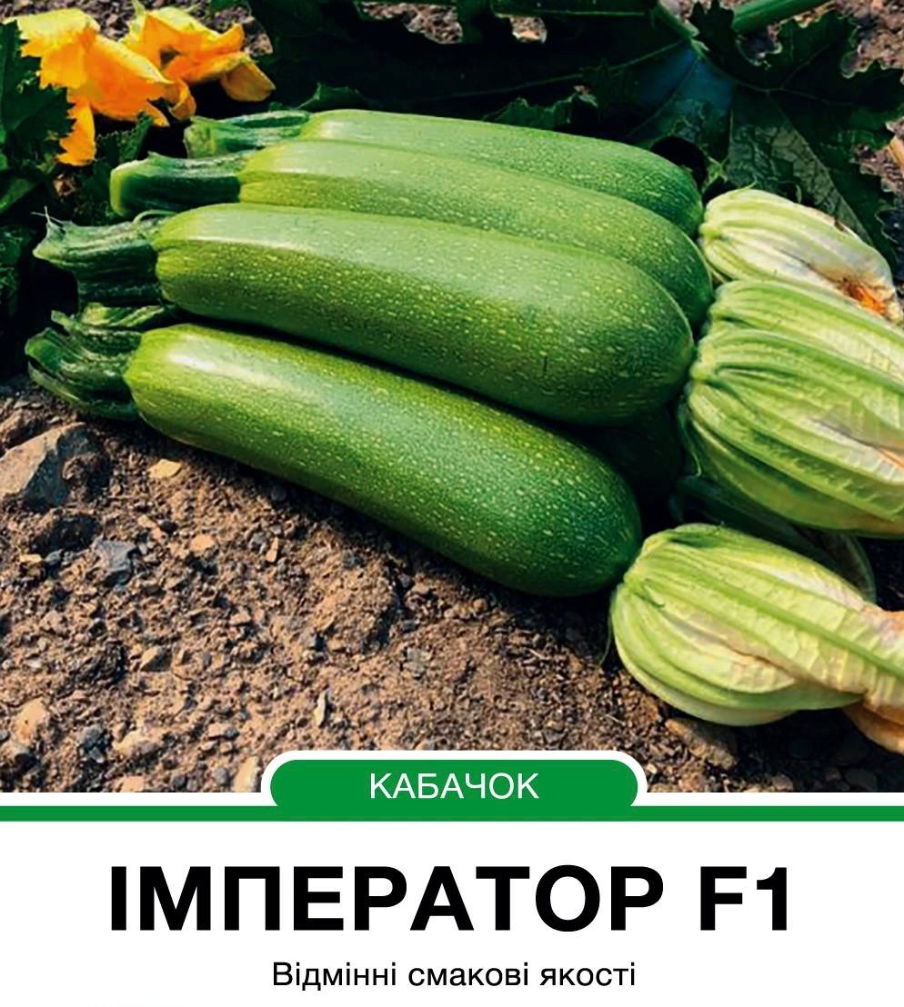Насіння кабачків Імператор F1 — ранній високоврожайний кущовий гібрид кабачка. Плоди циліндричні, насичено-зеленого кольору, з білою м’якоттю, дуже однорідні, ніжні на смак. Тривалий час не грубіють і придатні для переробки навіть при переростанні. В одній листовій пазусі формується по кілька плодів. Маса одного плоду становить 200–400 г.