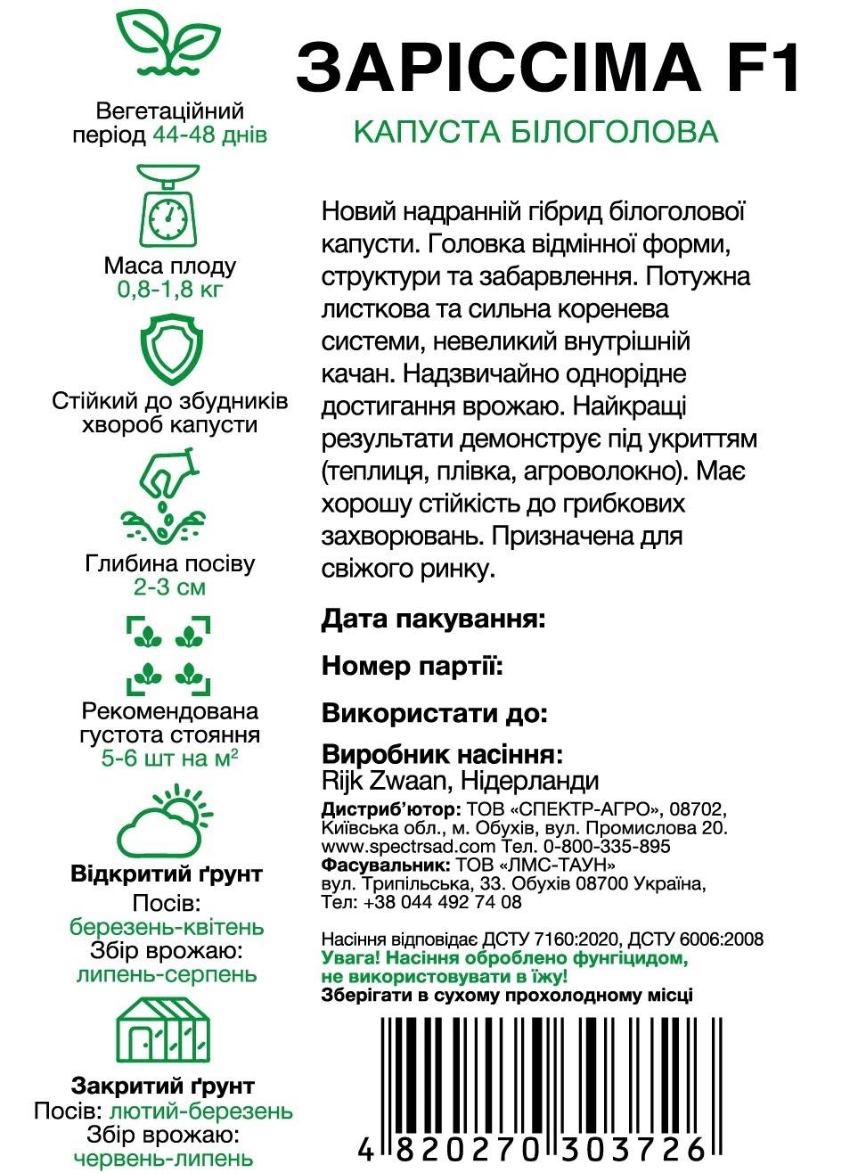 Насіння капусти білоголової Заріссіма F1 — надранній гібрид із дуже швидким та дружним достиганням урожаю. Формує щільні головки правильної форми, з відмінною внутрішньою структурою та приємним забарвленням. Рослина має потужний листковий апарат, сильну кореневу систему та невеликий внутрішній качан, що забезпечує високий товарний вигляд продукції.