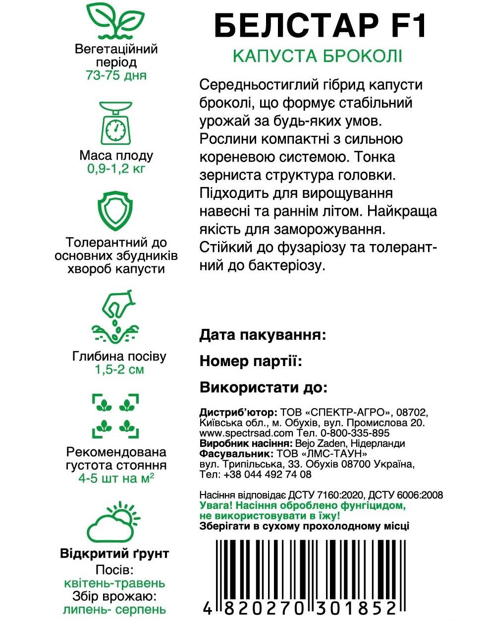 Насіння капусти броколі Белстар F1 — середньостиглий гібрид, який формує стабільний урожай за будь-яких умов. Рослини компактні з потужною кореневою системою, головки тонкозернисті, щільні, масою 0,9–1,2 кг.