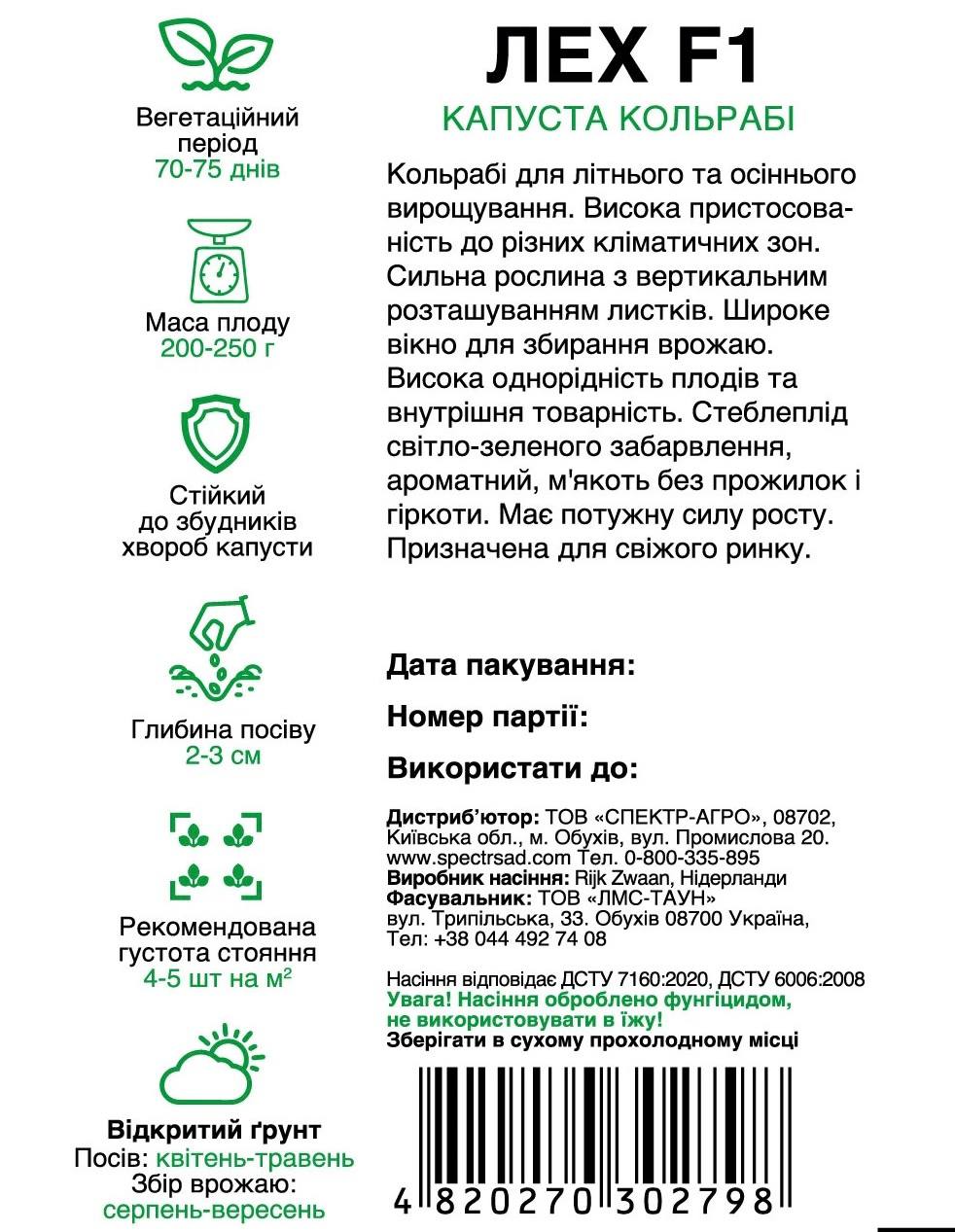 Насіння капусти кольрабі Лех F1 — середньостиглий гібрид для літнього та осіннього вирощування, із високою пристосованістю до різних кліматичних зон. Рослина сильна, із вертикальним розташуванням листя, що забезпечує широке вікно для збирання врожаю.