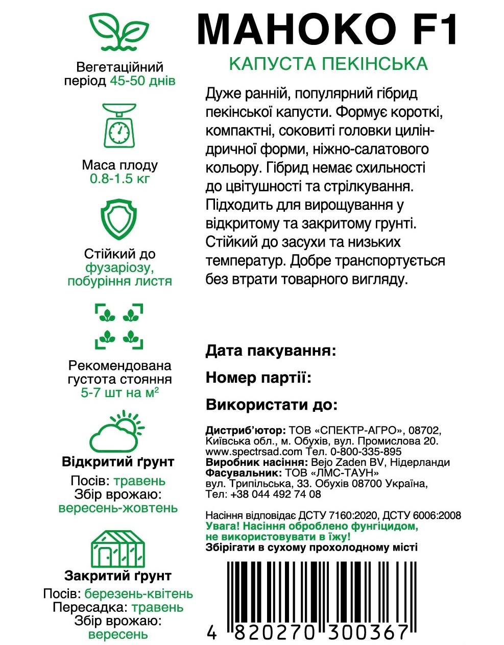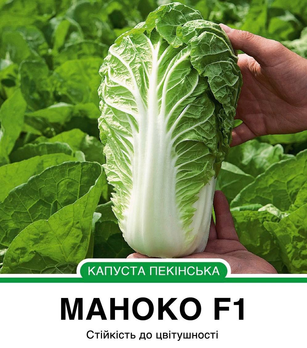 Насіння капусти пекінської Маноко F1 — дуже ранній гібрид пекінської капусти, що користується великою популярністю. Формує короткі, компактні, соковиті головки циліндричної форми ніжно-салатового кольору, без схильності до цвітушності та стрілкування. Підходить для вирощування у відкритому та закритому ґрунті.