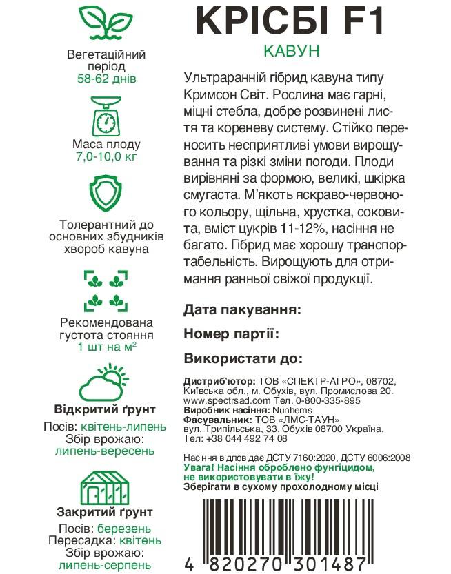 Насіння кавуна Крісбі F1 — ультраранній гібрид типу Кримсон Світ. Рослина має гарні, міцні стебла, добре розвинені листя та кореневу систему. Стійко переносить несприятливі умови вирощування та різкі зміни погоди. Плоди вирівняні за формою, великі, шкірка смугаста. М’якоть яскраво-червоного кольору, щільна, хрустка, соковита, вміст цукрів 11–12%, насіння невелике. Середня маса плоду становить 7,0–10,0 кг.