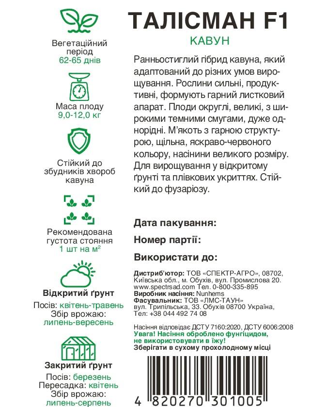 Насіння кавуна Талісман F1 — ранньостиглий гібрид, адаптований до різних умов вирощування. Рослини сильні та продуктивні, формують потужний листковий апарат і забезпечують стабільне зав’язування плодів. Плоди великі, округлі, з характерними широкими темними смугами та високою однорідністю. М’якоть щільна, яскраво-червона, із добре розвиненою структурою та великими насінинами.