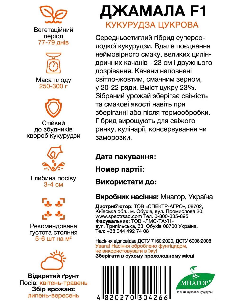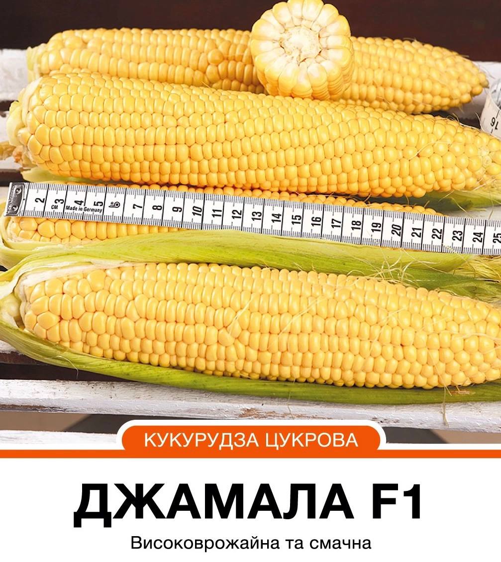 Насіння кукурудзи цукрової Джамала F1 — середньостиглий гібрид суперсолодкої кукурудзи з дружнім дозріванням. Формує великі циліндричні качани довжиною до 23 см, заповнені світло-жовтим, смачним зерном у 12–14 рядів. Вміст цукру у зерні перевищує 20%, що забезпечує неперевершений смак.