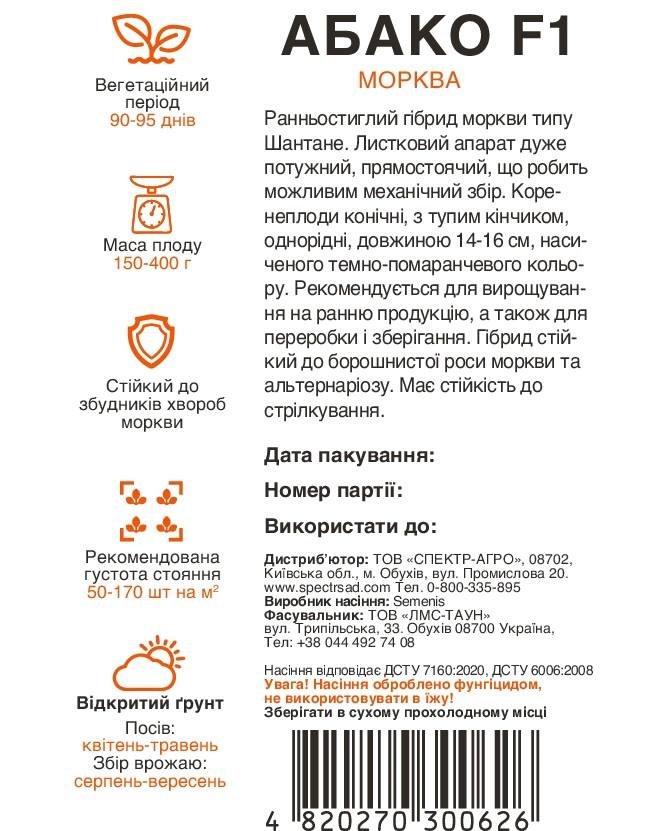 Насіння моркви Абако F1 — ранньостиглий гібрид моркви типу Шантане. Рослина має потужний прямостоячий листковий апарат, що дозволяє проводити механічний збір. Коренеплоди конічної форми з тупим кінчиком, однорідні, довжиною 14–16 см, насиченого темно-помаранчевого кольору.