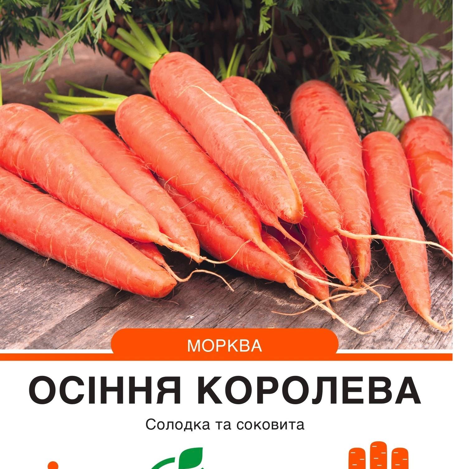 Насіння моркви Осіння королева — пізньостиглий високоврожайний сорт моркви. Коренеплоди циліндричні, у нижній частині злегка конічні, насичено-помаранчевого кольору, довжиною до 25 см та діаметром близько 5 см, рівні, гладкі та привабливі.