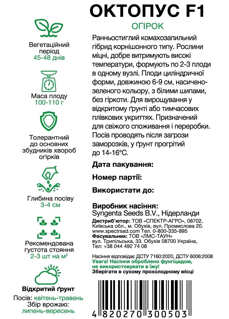 Насіння огірків Октопус F1 — ранній гібрид комахозапильного огірка корнішонного типу. Рослина міцна, добре переносить високі температури, формує одночасно 2–3 плоди в одному вузлі. Плоди циліндричної форми, довжиною 6–9 см, насичено-зеленого кольору, з білими шипами, без гіркоти, зберігають товарний вигляд під час зберігання та транспортування.