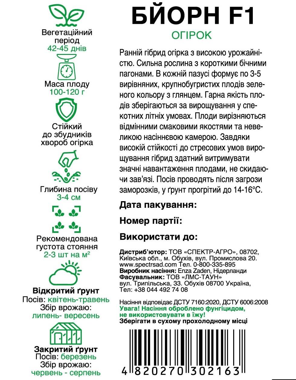 Насіння огірків Бйорн F1 — ранній високоврожайний гібрид огірка. Рослина сильна, з короткими бічними пагонами, формує в кожній пазусі по 3–5 вирівняних, крупнобугристих плодів зеленого кольору з глянцем. Плоди мають відмінний смак, невелику насіннєву камеру та гарну бугристість, що зберігається навіть у спекотні літні умови.
