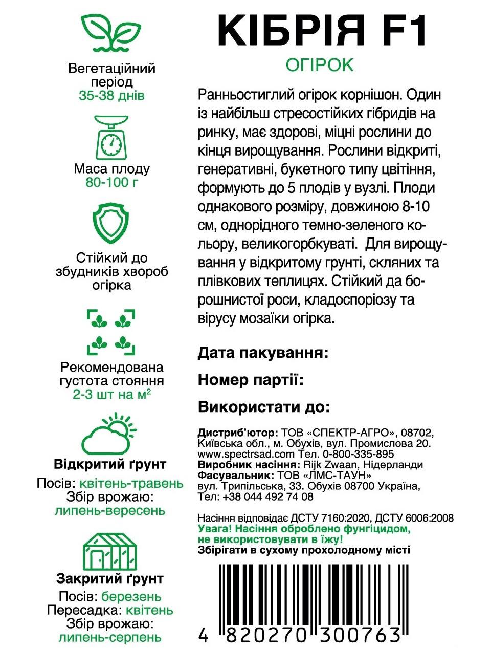 Опис (Огірок Кібрія F1 корнішон партенокарпічний,10 насінин)