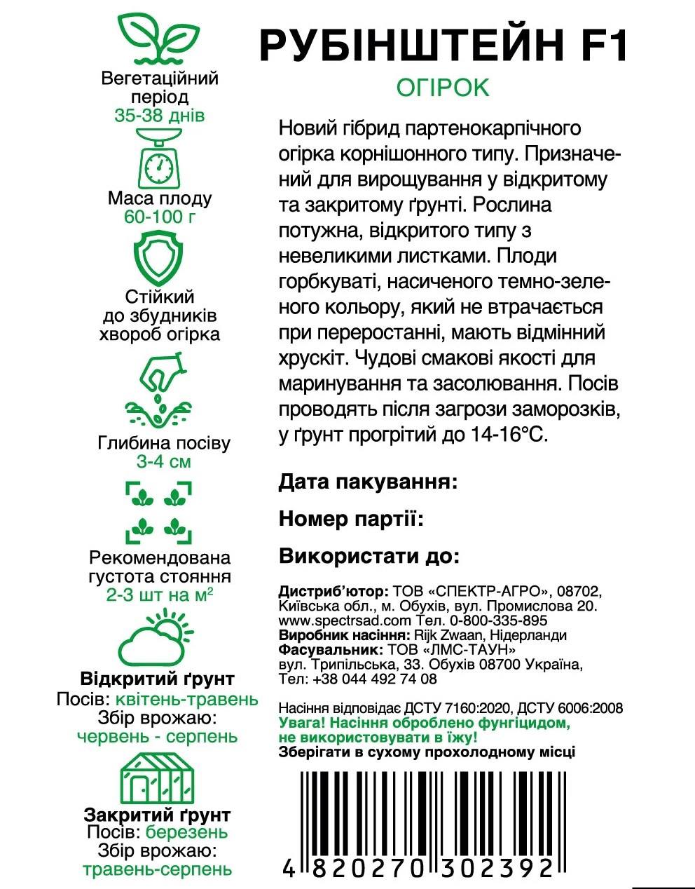 Насіння огірків Рубінштейн F1 — новий гібрид партенокарпічного огірка корнішонного типу. Рослина потужна, відкрита, з невеликими листками. Плоди горбкуваті, насиченого темно-зеленого кольору, який не втрачається при переростанні, хрусткі та смачні. Ідеальні для маринування та засолювання.