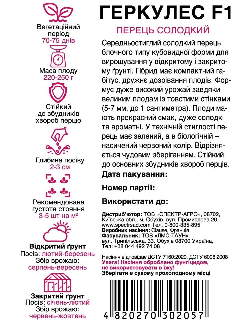 Насіння солодкого перцю Геркулес F1 — середньоранній гібрид кубовидного типу для вирощування у відкритому та закритому ґрунті. Плоди великі, з товстими стінками (5–7 мм), дружнє дозрівання та високий урожай завдяки компактному габітусу рослини.