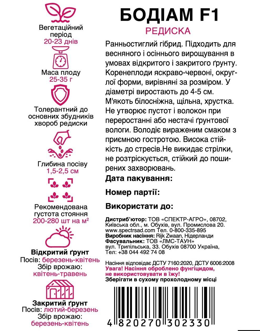 Насіння редиски Бодіам F1 — надранній гібрид, що формує коренеплід за 20–23 дні при оптимальних умовах вирощування.