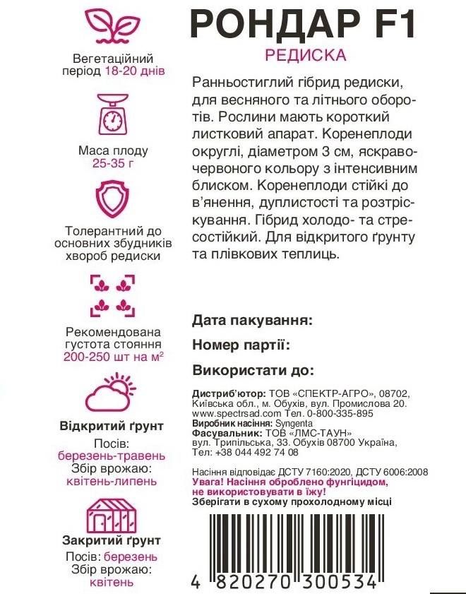 Насіння редиски Рондар F1 — ранньостиглий гібрид редиски, призначений для весняного та літнього оборотів.