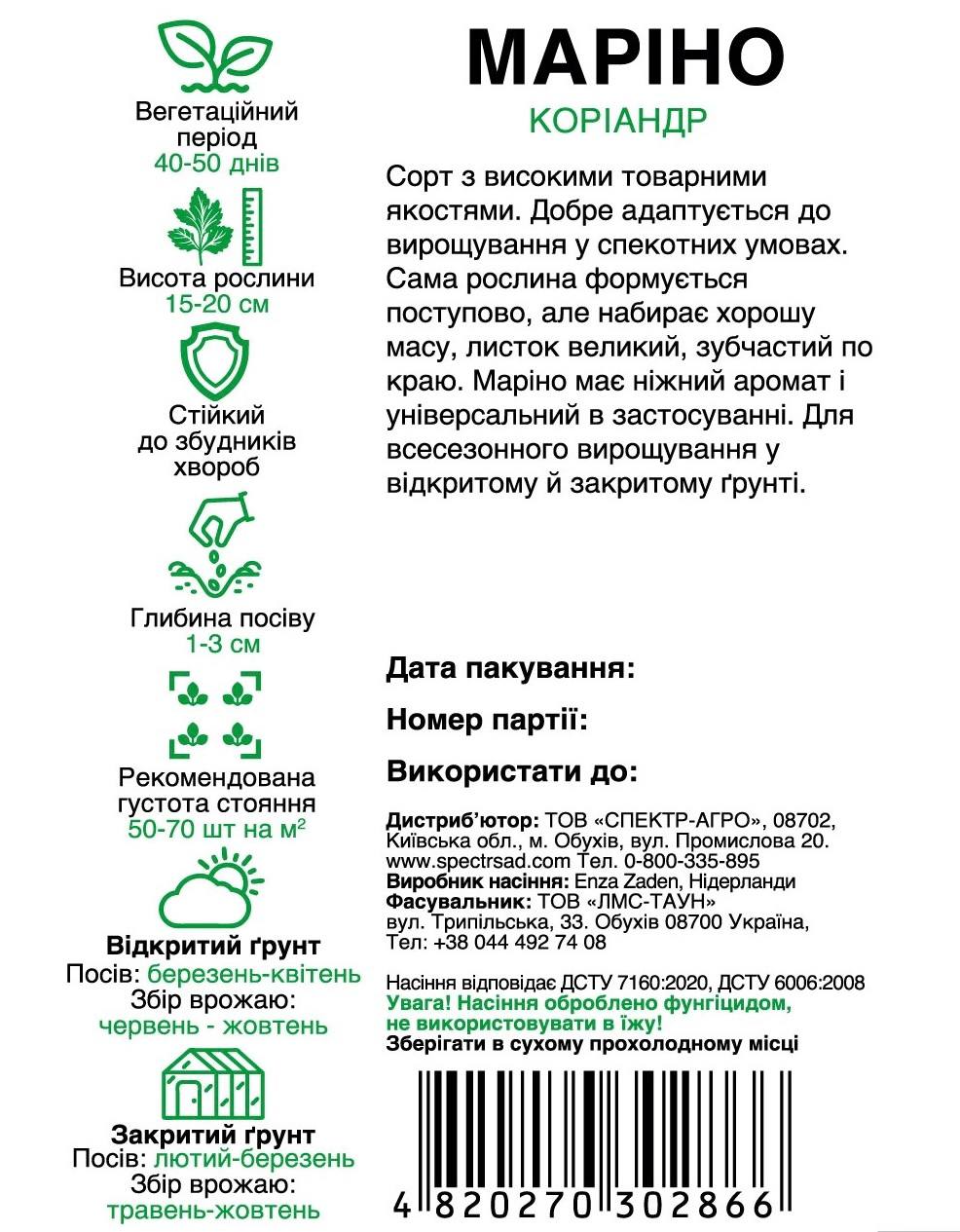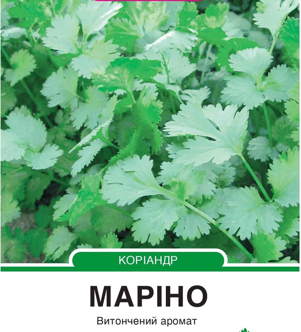 Насіння зелені коріандра Маріно — високоякісний сорт коріандра з ніжним ароматом і універсальним застосуванням. Рослина формується поступово, листя велике, зубчасте по краю, добре адаптується до спекотних умов вирощування.