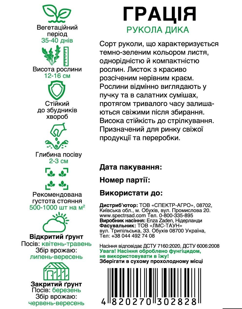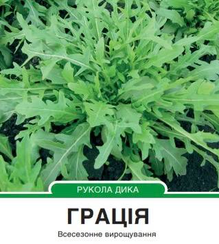 Насіння руколи Грація — сорт з темно-зеленим листям, однорідними та компактними рослинами.