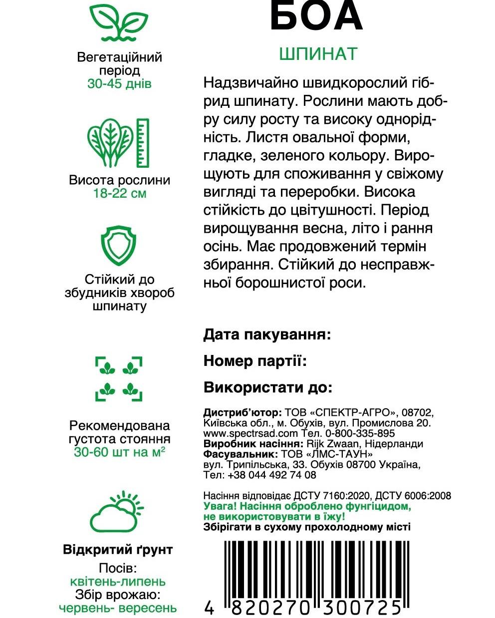 Насіння шпинату Боа, упаковка 200 шт — надзвичайно швидкорослий гібрид шпинату. Рослини потужні, однорідні, з овальним, гладким зеленим листям. Висока сила росту забезпечує стабільний урожай. Призначений для споживання у свіжому вигляді та переробки. Відзначається стійкістю до цвітушності та основних збудників хвороб, включно з несправжньою борошнистою росою. Період вирощування: весна, літо та рання осінь. Має продовжений термін збирання.
